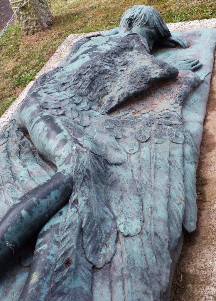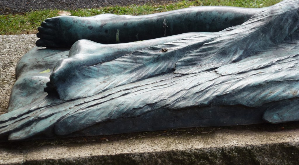 Here, the beautifully sculptured wings show the straps which had attached them to Icarus’s shoulders. The melting feathers drape the body like a shroud.