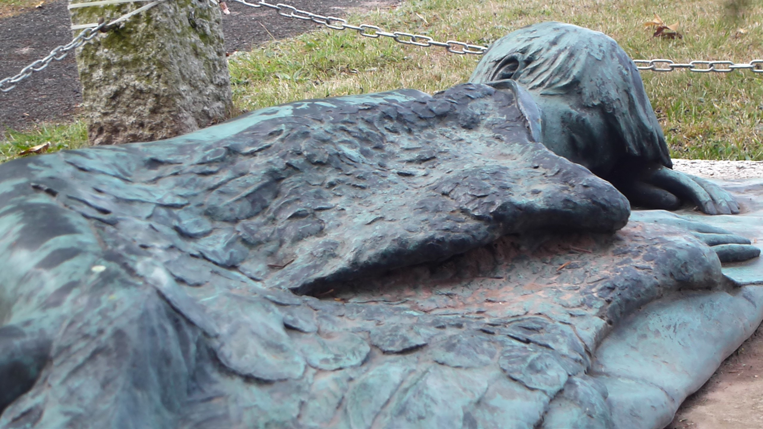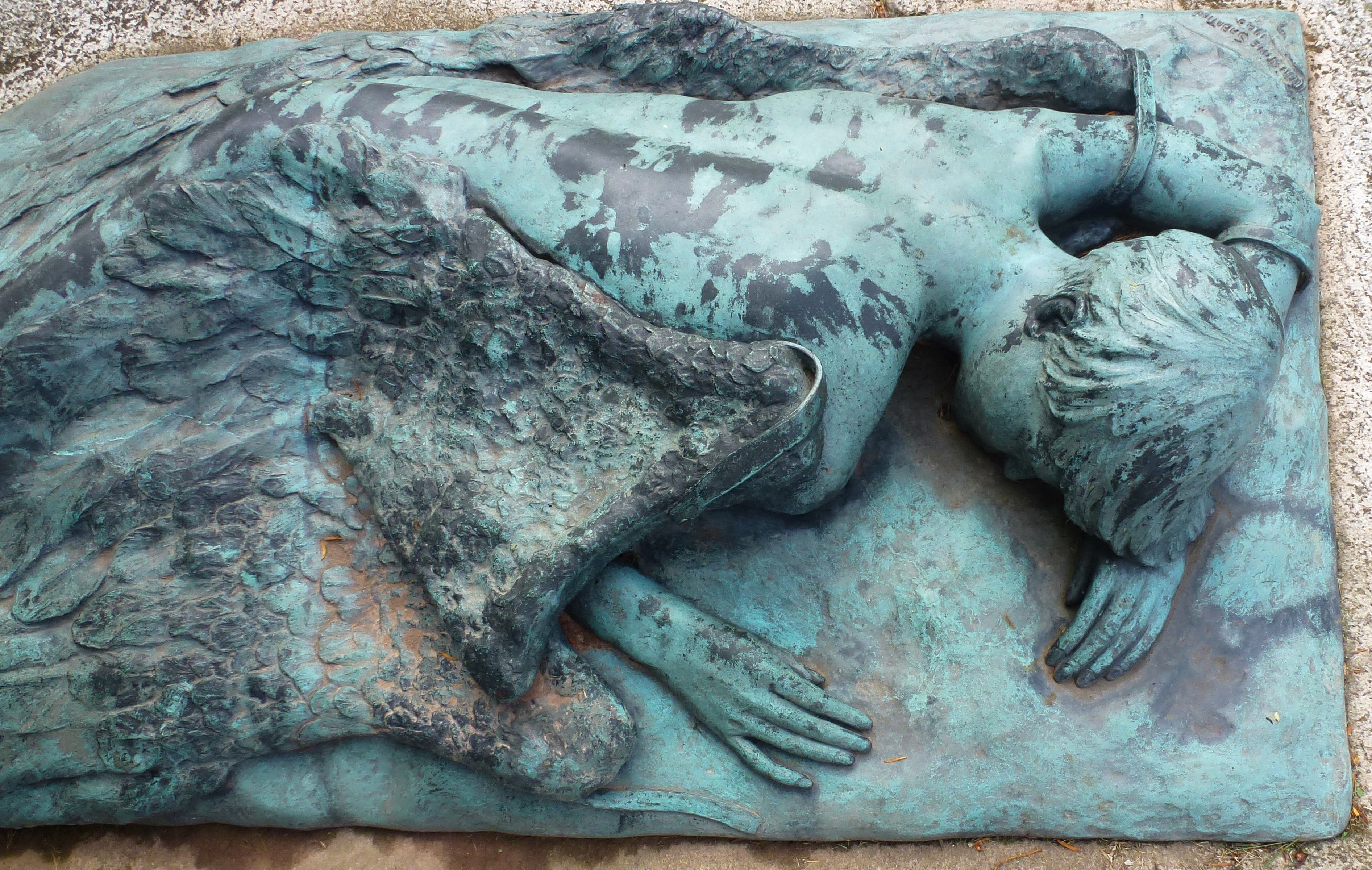 Here, the beautifully sculptured wings show the straps which had attached them to Icarus’s shoulders. The melting feathers drape the body like a shroud.