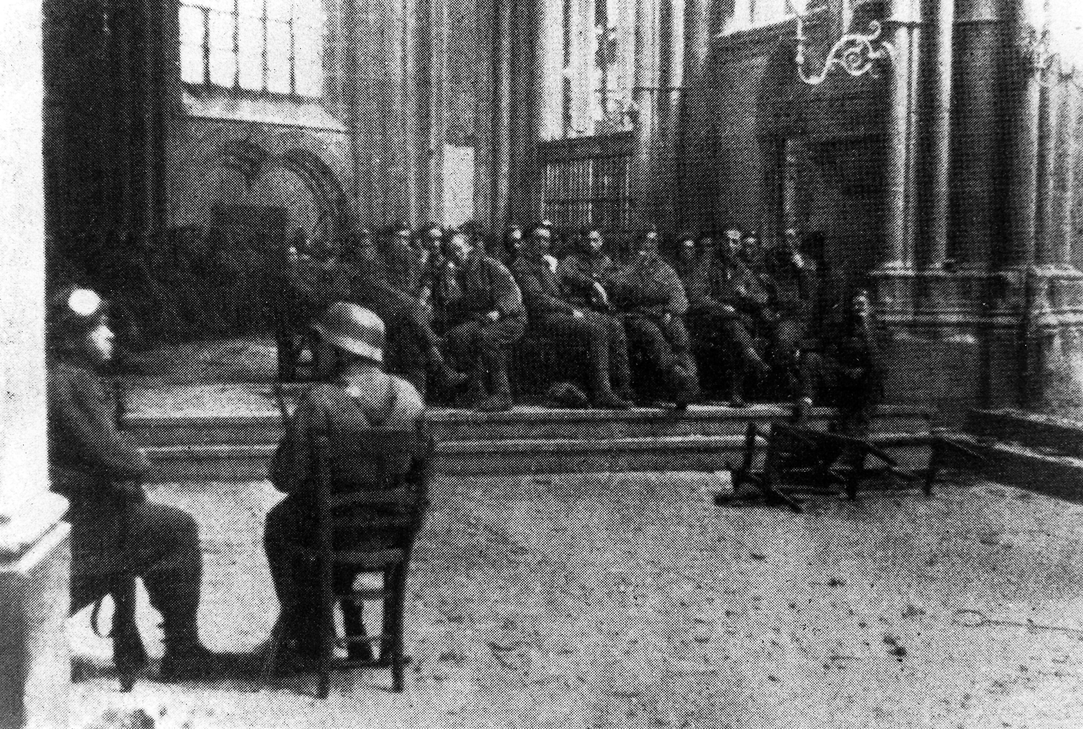 The tower of St Eusebius had been seriously damaged during the fighting; however, the interior had not been greatly harmed and it was here that one of the German captors took a photograph of the men they were holding. A spectacular war trophy, the photograph would be printed in the 1944 Christmas book of the 10th Panzer Division, known as the Frundsberg.